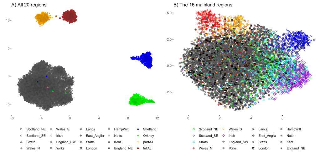 Fascinating insights into the regional differentiation within the UK and Ireland – with Mike Halachev, Jim Wilson and others. Remarkably, even with the current – far from complete – genomic coverage of regional populations we see evidence for different rare variants within different regions. With conservative filtering we find that a fraction of these regionally enriched rare variants are likely to have adverse biomedical consequences in homozygous individuals. Now available on Nature Comms with commentary in the Economist – following a marathon review process of ~2 years!